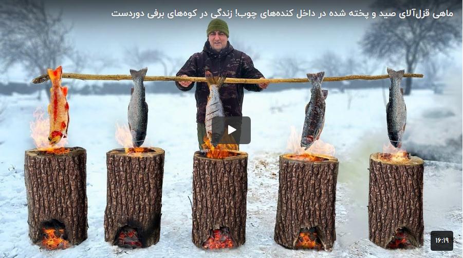 ماهی قزلآلای صید و پخته شده در داخل کندههای چوب! زندگی در کوههای برفی دوردست
